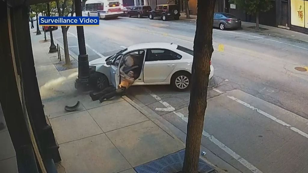 Videolta näkyy, kuinka poliisimies raahautuu auton perässä, kun hän on pysäyttämässä menopeliä Chicagon Pilsenin asuinalueella sunnuntaiaamuna. Auto ajaa hurjaa vauhtia kohti valopylvästä.