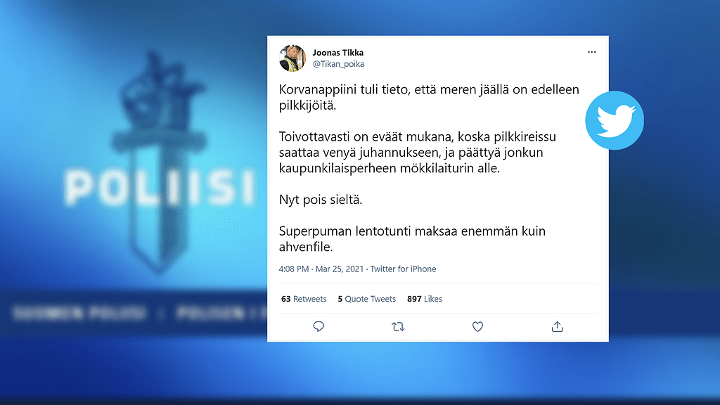 Länsi-Suomen poliisilaitoksen komisario ja yleisjohtaja Joonas Tikka kirjoittaa Twitterissä, että hänen tietoonsa on tullut pilkkijöitä, jotka jatkavat yhä harrastustaan, vaikka kevät etenee kovaa vauhtia.