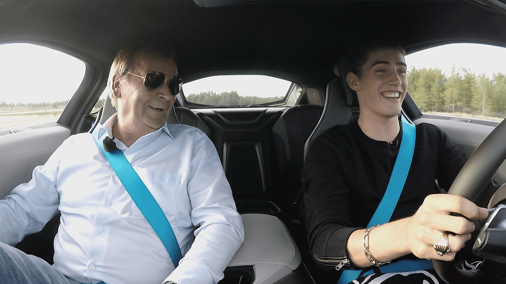 – Ei sua kyllä huimaa yhtään, jarrua! Nyt pelottaa, Alén sanoo ja hakee turhaa kädellään kauhukahvaa BMW i8:n ohjaamossa.