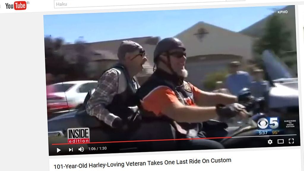 101-vuotiaan veteraanin viimeinen toive oli päästä ajelulle Harley-Davidsonilla.