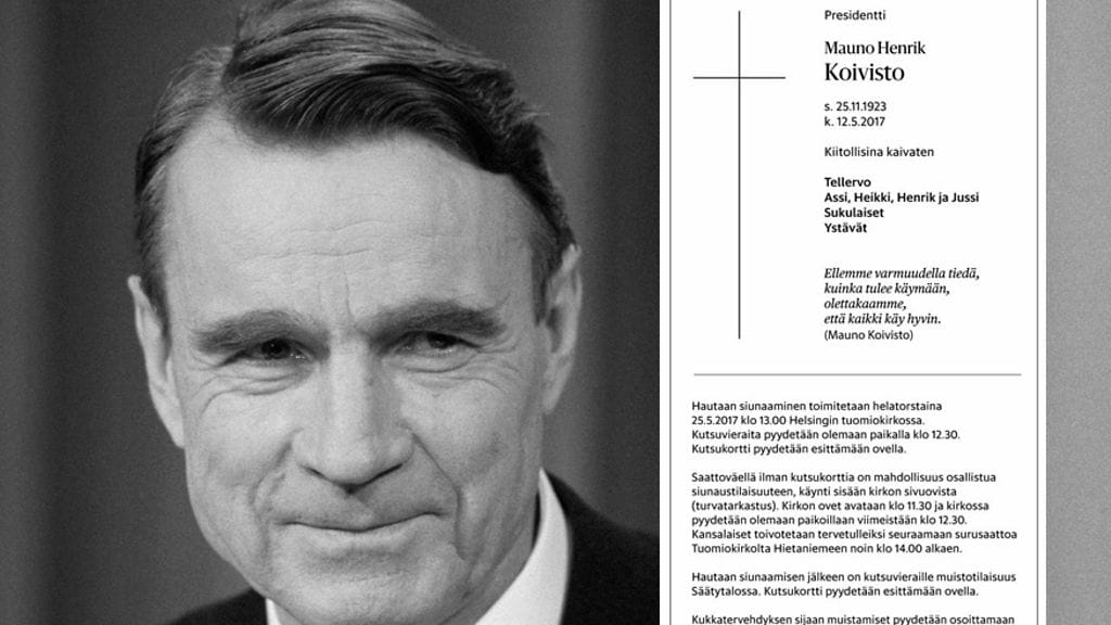 Presidentti Mauno Koiviston kuolinilmoitus on julkaistu tänään Helsingin Sanomissa sekä Turun Sanomissa. Presidentti menehtyi viime viikolla, 12.5. ollessaan 93-vuotias.
