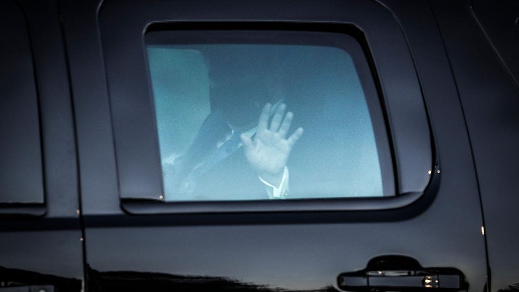 Lähtiessään Valkoisesta talosta Trump näytti peukkua ja vilkutti yleisölle ja kameroille, ja lähti sitten kohti sairaalaa helikopterilla.