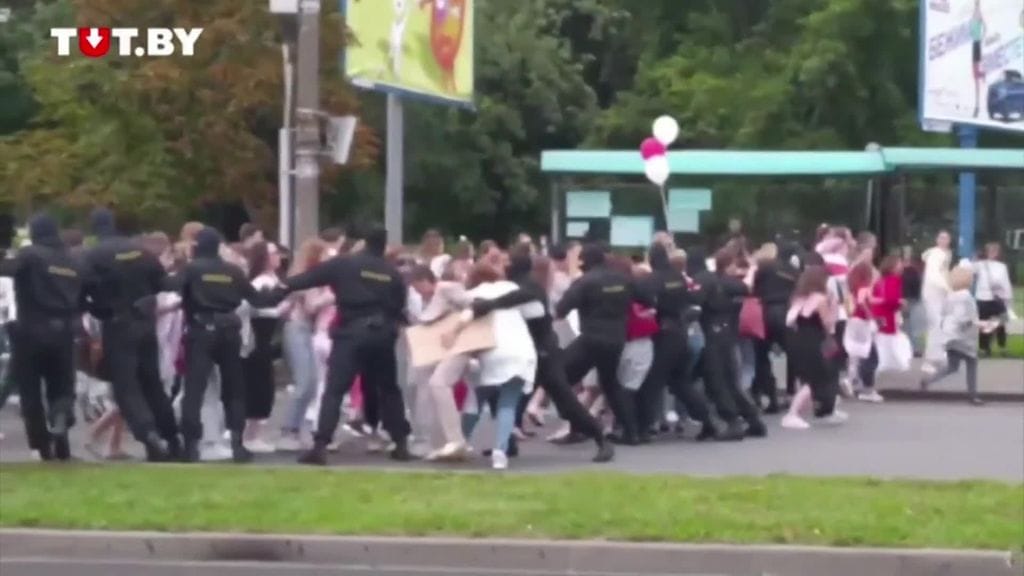 Lauantaina tuhannet naiset marssivat lippujen, kukkien ja ilmapallojen kanssa hallitusta vastustavissa mielenosoituksissa pääkaupungissa Minskissä. Videolle tallentui, kuinka mielenosoittajat mursivat mellakkapoliisien rintaman.