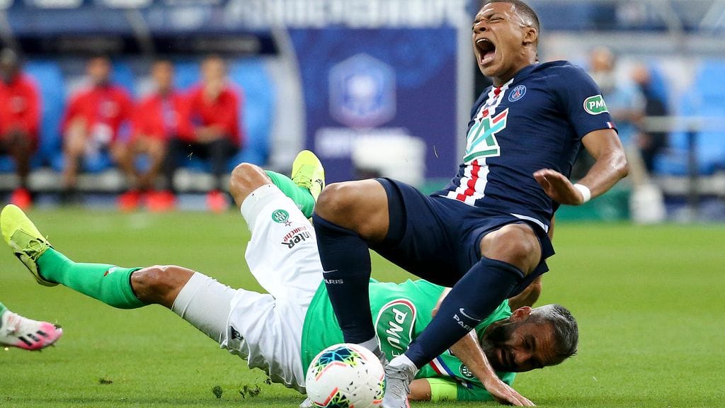 Mbappe loukkaantui, kun Saint-Etiennen Loic Perrin taklasi häntä punaisen kortin arvoisesti. PSG:n mukaan Mbappen nilkka on vääntynyt ja nivelsiteissä on vaurioita.