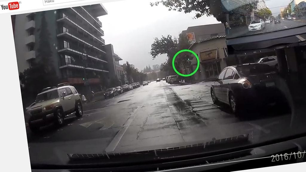 Auton kojelautakameraan tallentui läheltä piti -tilanne Kalifornian Palo Altossa. Videon kuvannut kuljettaja lähestyy valo-ohjattua risteystä ja hänelle palaa vihreä valo.