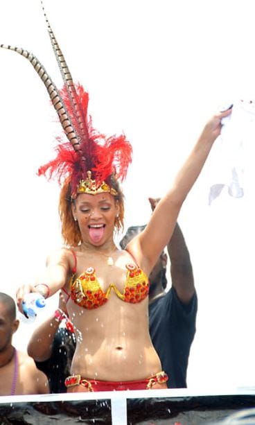 R&B-tähti Rihanna, 23, innostui juhlimaan villisti Kadooment Day -paraatissa kotimaassaan Barbadoksella 1. elokuuta. Paraati on ikivanha perinne 1780-luvulta, jossa paikalliset ilakoivat juhla-asut yllään ja kokoontuvat yhteen onnistuneen sokerinviljelyskauden päätteeksi. Paraatista alkaa lähes kuukauden mittaiset juhlat. Paikalliset valitsevat vuosittain "kuninkaan ja kuningattaren", jotka ovat onnistuneet kasvattamaan eniten sokerinruokoja.