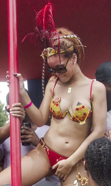Rihanna riehaantui Kadooment Day -paraatissa Barbadoksella. Laulaja heilui kotimaansa kaduilla olemattomissa bikineissä drinkki kädessään.