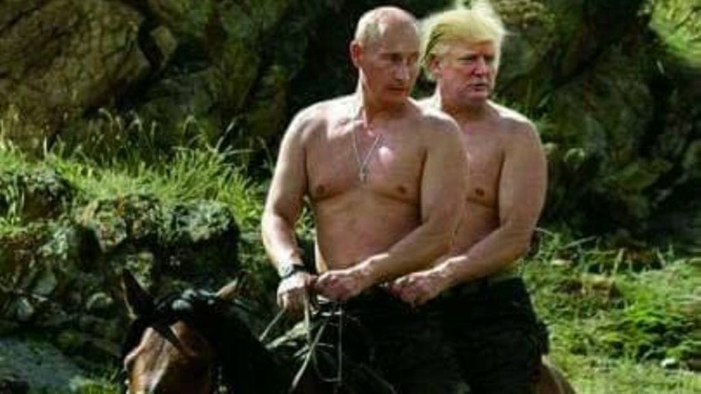 Osa meemikuvista liittyy Donald Trumpin poliittisiin lausuntoihin: yhdessä kuvassa hän ratsastaa yläosattomana Venäjän presidentin Vladimir Putinin kanssa. Putin tuki Trumpia Yhdysvaltain presidentiksi ja Trump kannatti hyvien Venäjä-suhteiden ylläpitoa.