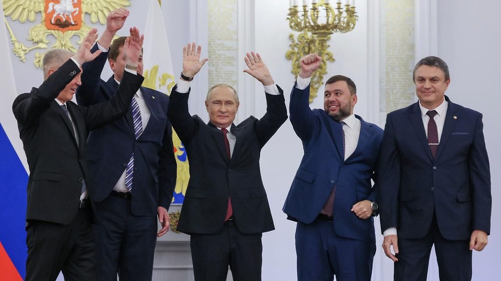 Putin piti Kremlissä perjantaina pitkähkön linjapuheen, minkä jälkeen hän ja miehitettyjen nukkehallintojen johtajat allekirjoittivat alueiden liittymissopimukset. Liittämisen taustalla ovat lavastetut kansanäänestykset, jotka päättyivät tiistaina.