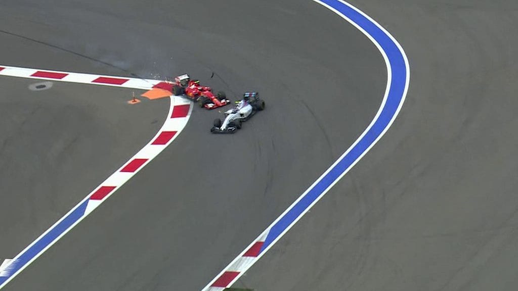 Kimi Räikkönen pilasi Valtteri Bottaksen kilpailun Sotshissa viimeisellä kierroksella.