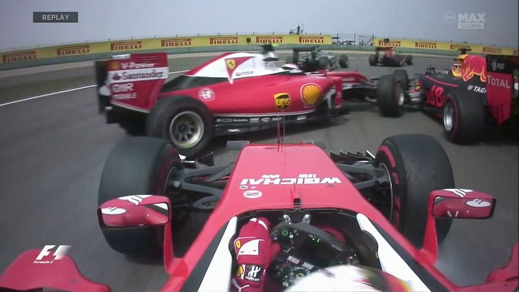 – Minulle tuli osuma. Minulla ei ollut mahdollisuutta väistää, koska Red Bull tuli sisäpuolelta kuin hullu ja osuin Kimiin. Keulani on rikkoutunut, Vettel kertoi tiimiradiossa.