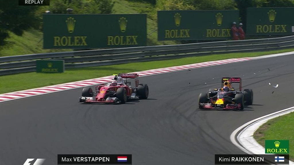 Kimi Räikkösen upea Unkarin GP sai ikävän takaiskun, kun suomalaiskuski törmäsi Max Verstappenin perään ohitustilanteessa.