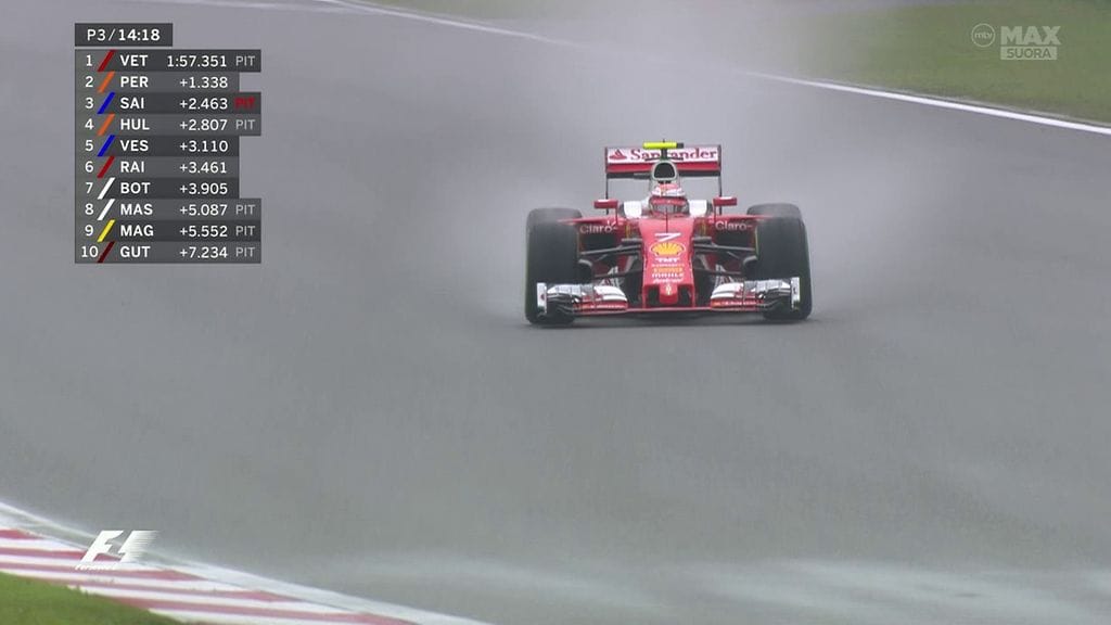 Eilisen kuivan päivän nopein Kimi Räikkönen oli aikavertailuissa 12:s, mutta hän oli alittamassa Vettelin aikaa kunnes joutui ruuhkaan ja lopetti kierroksensa kesken. Hänen aikakierroksensa tuli märänkelin renkailla, kesken jääneellä kierroksella hänellä oli välikelin kumit. Aikavertailun turhuudesta huolimatta Räikkösen ajaminen märällä näytti tasapainoiselta.