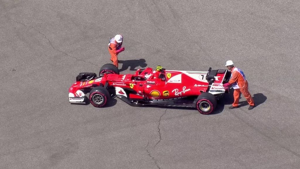 Räikkösen auto hyytyi kesken menon. Hän joutui pysähtymään radan ulkopuolelle.
