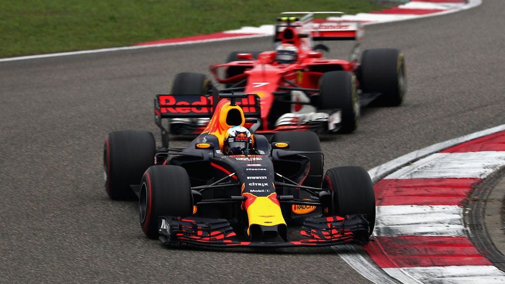 Kierros 31: Räikkönen on kisassa neljäntenä ja ajaa samoja kierrosaikoja kolmantena olevan Ricciardon kanssa. Kärkikaksikko Lewis Hamilton ja Sebastian Vettel ovat jo tässä kohtaa karanneet, mutta australialainen on vain 1,12 sekuntia suomalaista edellä. Toinen Red Bull -kuski Max Verstappen on juuri varikolla käytyään yli 18 sekunnin päässä takana.