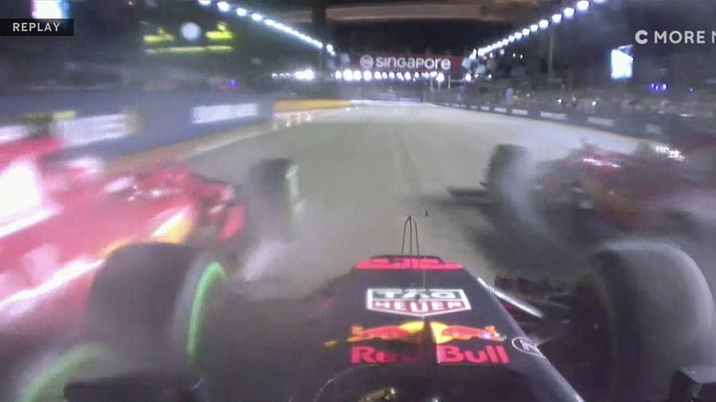 Kimi Räikkösen, Sebastian Vettelin ja Max Verstappenin kisa päättyi Singaporen sateessa lyhyeen. Eri kuvakulmista voi tehdä omat johtopäätöksensä siitä, kenen syyksi kolari pitäisi laittaa.