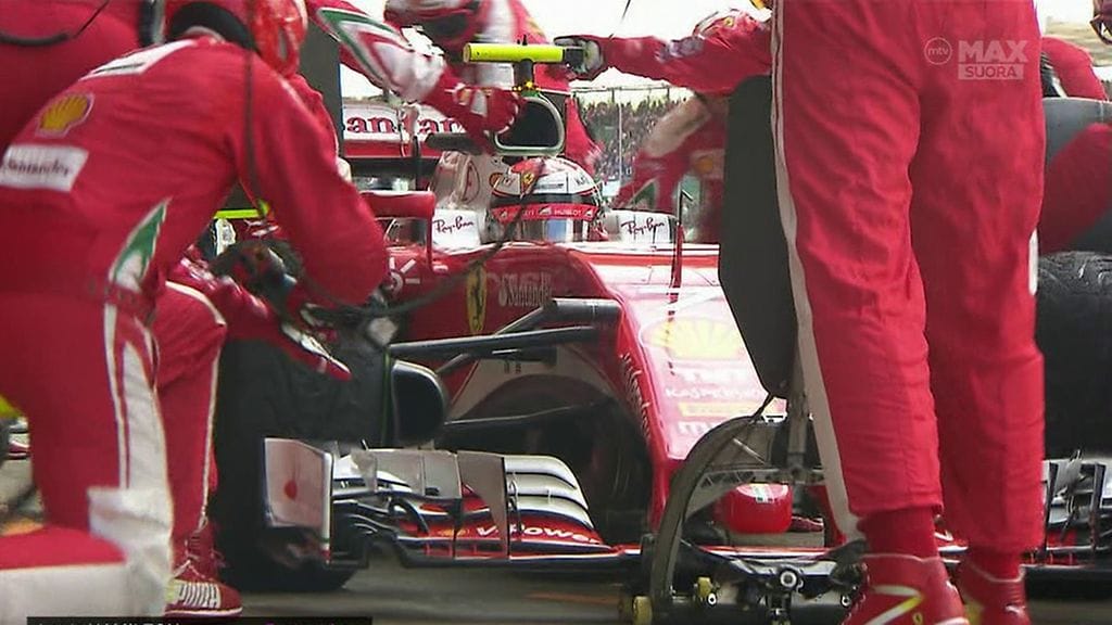 Kisan alla iskenyt rankka sadekuuro kasteli radan niin perusteellisesti, että kilpailu käynnistyi viidellä turva-auton takana ajetulla kierroksella. Turva-auton poistuttua Räikkönen suuntasi ensimmäisenä vaihtamaan välikelin renkaat.