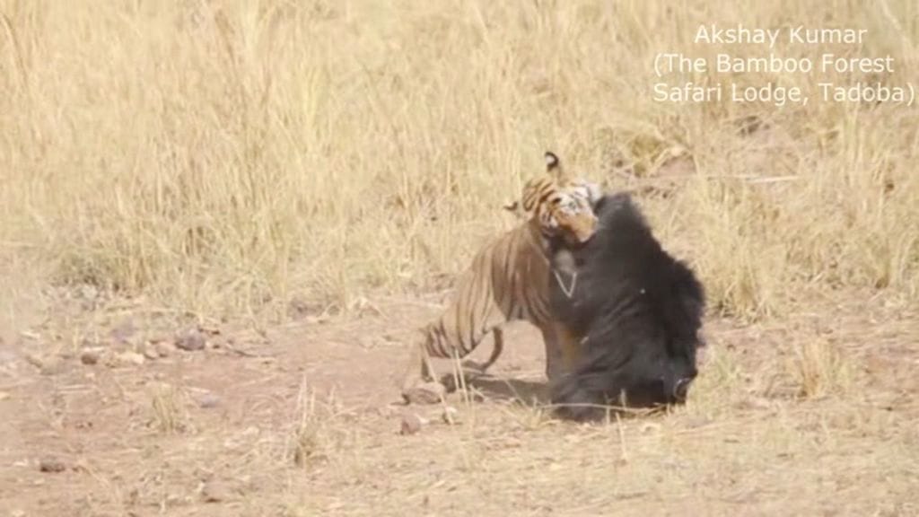 Intiassa kuvattiin tänään harvinainen ja hurja tappelu huulikarhun ja suurikokoisen urostiikerin välillä. Tappelun tallensi videolle luonnontutkija Akshay Kumar.