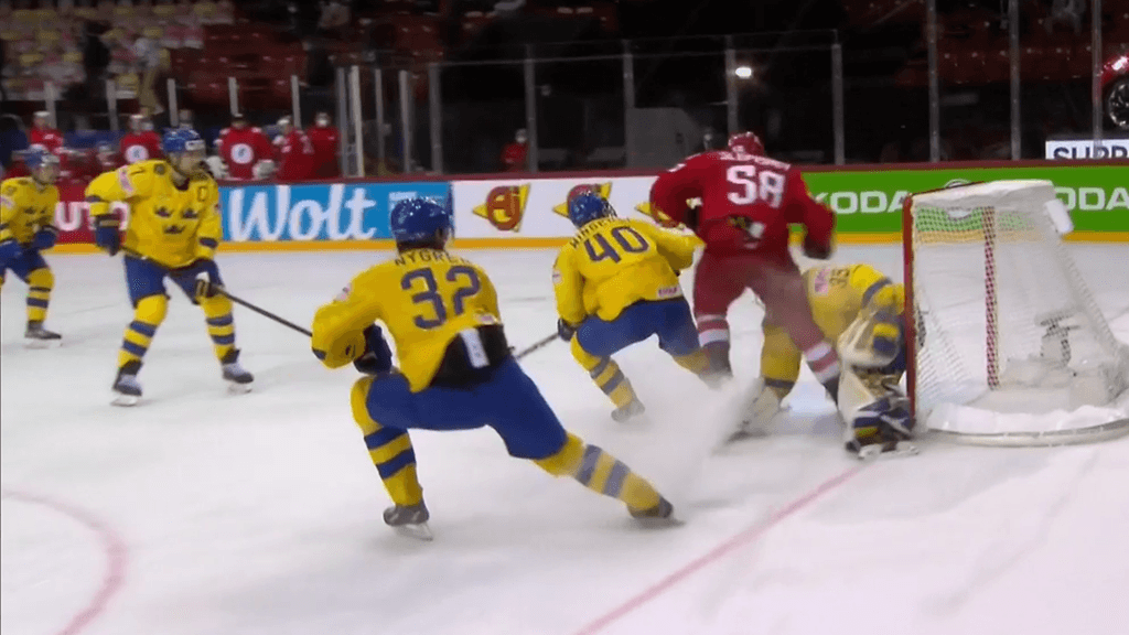 Slepishev ajoi toisessa erässä vauhdilla kohti Ruotsin maalia, mutta joutui Andreas Wingerlin taklauksen pysäyttämäksi. Venäjän kapteeni lennähti taklauksen jälkeen voimalla päin Reidebornia ja miehet kaatuivat maalikehikon sisään.