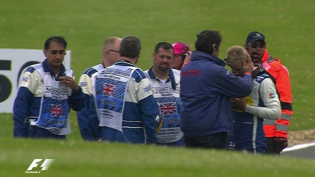Sauber-tallin kuljettaja Marcus Ericsson on viety tarkistettavaksi sairaalaan formula ykkösten Britannian GP:n rajun ulosajon jälkeen.