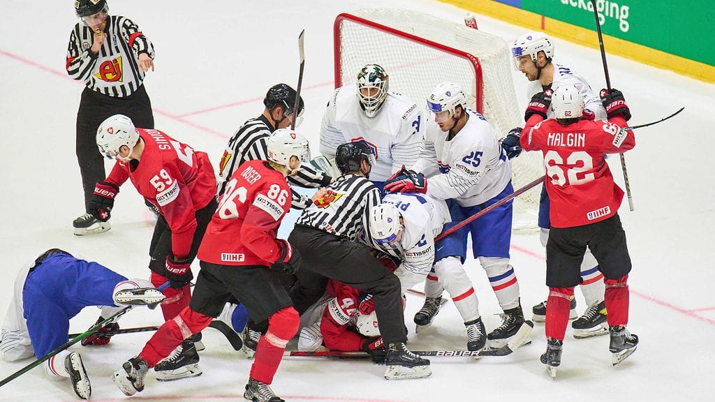 Ranska paineli jo 2–0-johtoon, kun toistaiseksi kaikki ottelunsa voittanut Sveitsi lähti otteluun hieman unisella asenteella. Sveitsille kahden maalin tappioasema tuntui ottavan koville, ja erän lopussa nähtiin, että tunteet kuumenivat.