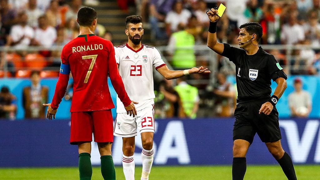 Ronaldo huitaisi kyynärpäällään Iranin topparia Morteza Pouraliganjia kaulaan. Pouraliganji jäi tilanteen jälkeen makaanaan maahan, ja Caceres kuunteli pitkään videotuomareiden näkemystä tilanteesta.