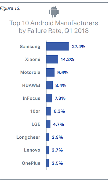 Android-puhelimien puolella tittelin vikaherkimmästä puhelinvalmistajasta nappaa Samsung. Tutkimuksen mukaan 27,4 prosentissa Samsungin laitteista on jonkin sortin vika. Toisena listalla on Xiaomi, jonka vastaava lukema on 14,2 prosenttia.