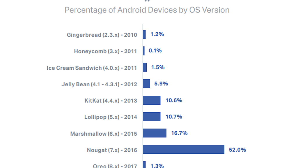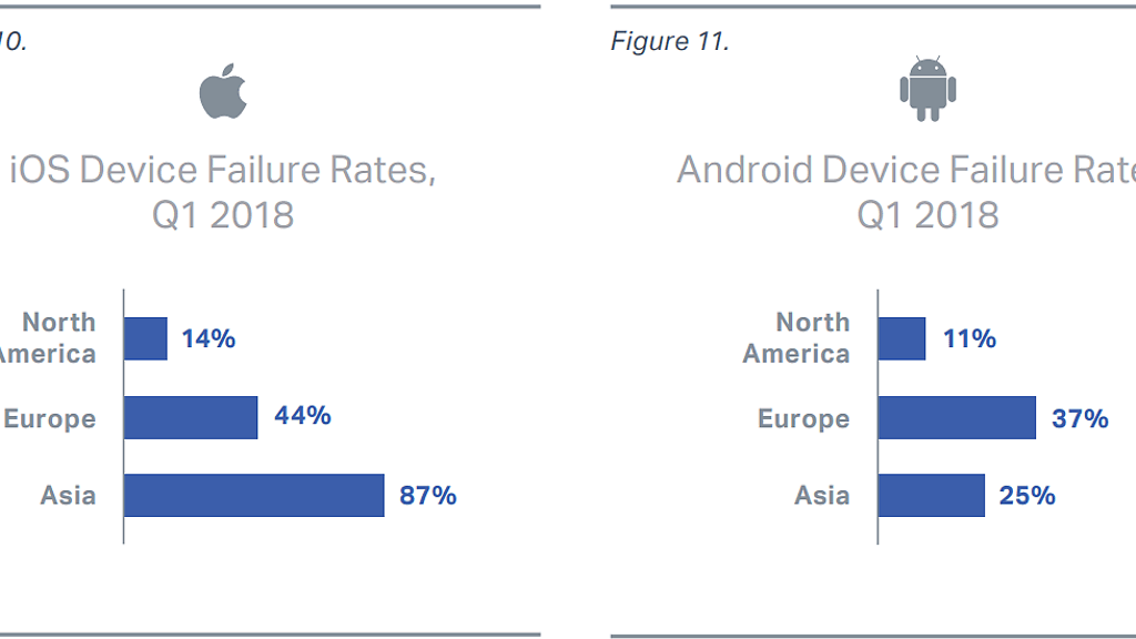 Kokonaisuudessaan Android-puhelimissa jopa 18,9 prosentissa on jonkinlaisia ongelmia. Applen iPhone-laitteissa lukema on 15,2 prosenttia, joten suuria erot eivät käyttöjärjestelmien väleillä ole. Suuri ero kuitenkin huomataan huoltoon tuotujen laitteiden käyttöjärjestelmäversioissa. iPhoneissa noin 74 prosentissa oli viimeisin iOS 11 -käyttöjärjestelmäversio, kun taas Android-puhelimissa yleisin versio oli vanhahko Android 7 Nougat. Jopa Android 2.3 Gingerbreadia esiintyi tutkimuksen aikana.