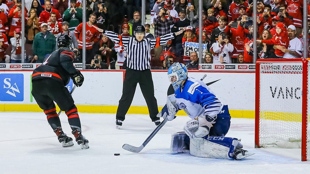 Kanada sai rangaistuslaukauksen, kun Evan Bouchardia rikottiin läpiajossa. Laukauksen ampui joukkueen kapteeni, tällä kaudella NHL:ssäkin pelannut Maxime Comtois. Hän lähestyi Suomen maalivahtia Ukko-Pekka Luukkosta hitaasti, eikä onnistunut yllättämään suomalaisvahtia.