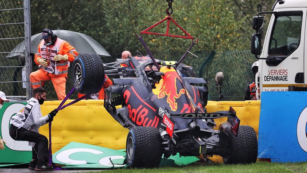 Perez ajautui ulos Span radan pitkän takasuoran jälkeisessä Les Combes -mutkayhdistelmässä. Meksikolaisen auton oikean puolen eturipustukset menivät täysin mutkalle kolarin myötä.