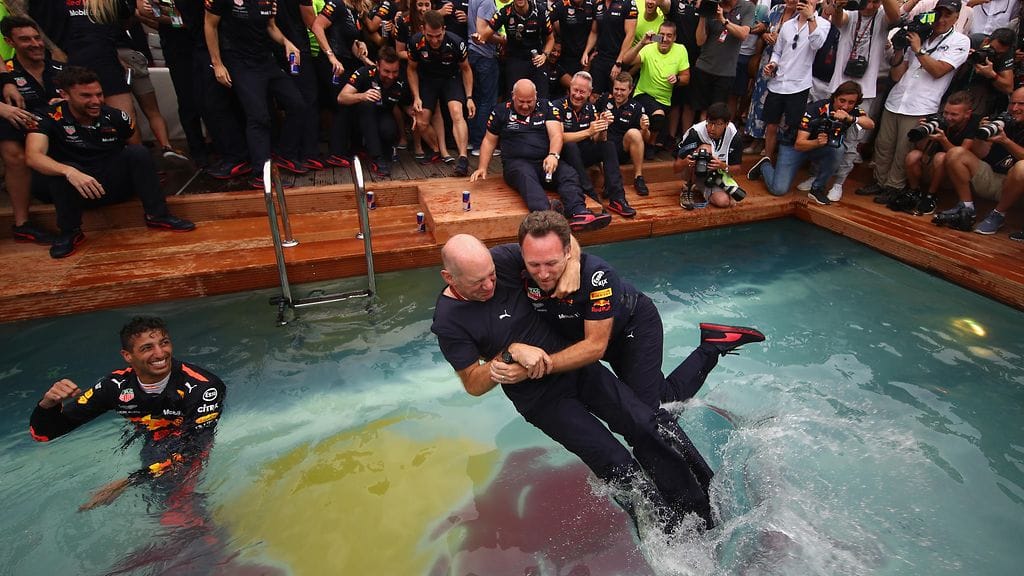 Legendaarisen Monacon GP:n voitto sai Red Bullin jäsenet hyppäämään uima-altaaseen. Jopa tallipäällikkö Christian Horner ja pääsuunnittelija Adrian Newey liittyivät kilpailun voittajan Daniel Ricciardon seuraksi vesileikkeihin.