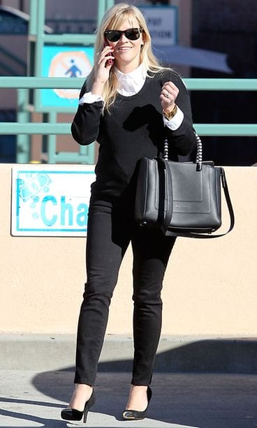 Witherspoon oli valinnut ylleen mustat pillihousut, mustan villapaidan ja valkoiset kauluspaidan, jonka kaulukset pilkottivat tyylikkäästi villapaidan alta. Asukokonaisuutensa tyylikäs Witherspoon oli täydentänyt mustalla nahkaisella laukulla, siroilla korkokengillä ja Blues Brothers -tyylisillä aurinkolaseilla.