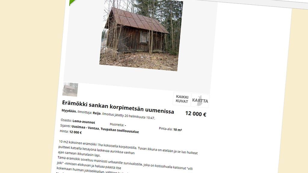 "Tämä erämökki soveltuu mainiosti urbaanille survivalistille, joka on kotisohvalla katsonut "villi joki" -nimisen elokuvan ja haluaa päästä itse kokemaan huiman jokiseikkailun."