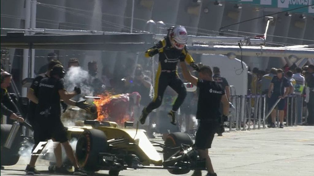 Magnussenin auto leimahti liekkeihin heti Malesian GP:n ensimmäisten harjoitusten alussa. Mekaanikot sammuttivat palon nopeasti, mutta liekit löivät sen jälkeen vielä moneen otteeseen.