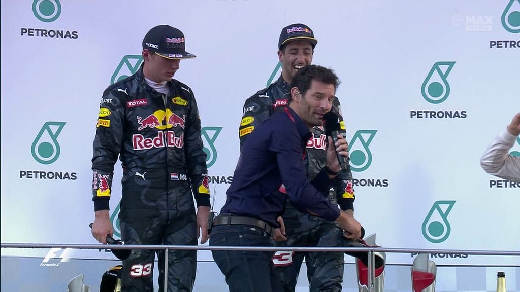 Malesian GP:ssä Ricciardo villitsi katsojia istuuduttuaan palkintojenjaon jälkeen ykköskorokkeelle ja riisuttuaan hitaasti kenkänsä. Hän sai Red Bullin tallipäällikkön Christian Hornerin, tiimikaverinsa Max Verstappenin ja jopa MM-sarjaa johtavan Mercedes-kuski Nico Rosbergin juomaan tossustaan, mutta haastattelijaksi tullut Webber ei suostunut enää maanmiehensä nöyryytettäväksi.