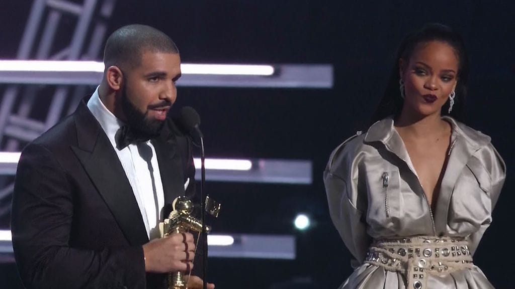 Vuosia sitten lyhyen ajan seurustellut kaksikko ei ole enää väleissä. Vuoden 2016 VMA-gaalassa Drake ylisti Rihannaa yhdeksi parhaista ystävistään antaessaan tälle musiikkivideomaailman edelläkävijöille omistettua palkintoa. Puheensa lopussa räppäri myönsi olleensa rakastunut Rihannaan 22-vuotiaasta asti.