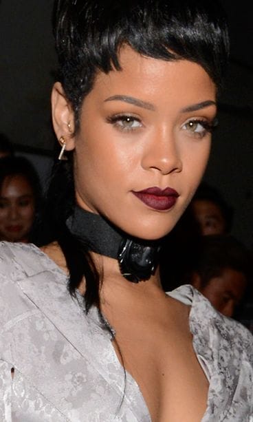 Laulaja Rihanna, 25, edusti River Islandin kevät/kesä 2014 -muotinäytöksessä Lontoossa viileissä tunnelmissa – ainakin mitä tulee naisen huulipunavalintaan. Rihanna on tunnettu viuhaan vauhtiin vaihtuvista hiusväreistään ja -malleistaan, erikoisista ja äärilaidasta toiseen heittäytyvistä asuvalinnoistaan, mutta meikissä nainen on seurannut kiltisti trendejä ja omaan hiusväriinsä sekä hipiäänsä sopivia sävyjä. Erityisesti kirkkaan punainen huulipuna on kuulunut naisen kestosuosikkeihin, mutta näin syksymmällä naisen huulilla on nähty myös viileää tummanpunaista.