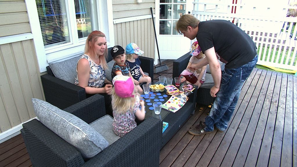 Riikka Sikkilän ja Ari Kanasen perheessä käy kova vilske. Esikoinen Nino, 5, touhuilee omiaan ja kolmevuotiaat kolmostytöt Minja, Peppi ja Tytti ovat omissa leikeissään.