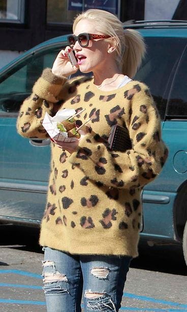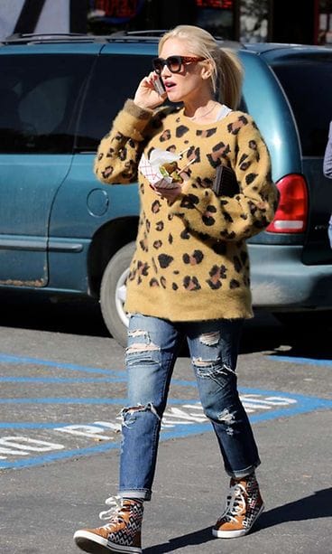 Raskaana oleva laulaja Gwen Stefani, 44, kuvattiin mukavassa ja rennossa arkityylissä Lake Arrowheadissa Kaliforniassa. Laulajatar oli vetäissyt ylleen pantterikuvioisen suuren villapaidan, rikotut farkut ja paidan väreihin sopivat tennarit. Ylisuuri villapaita piilottaa tehokkaasti raskaana olevan tähden vatsan. Stefanilla on ennestään kaksi lasta muusikkomiehensä Gavin Rossdalen kanssa.