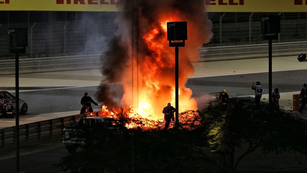 Grosjeanin auto katkesi kahtia ja syttyi täydessä polttoainelastissa räjähdysmäiseen tulipaloon, kun hän sinkoutui kolarissa radalta teräskaiteen läpi.