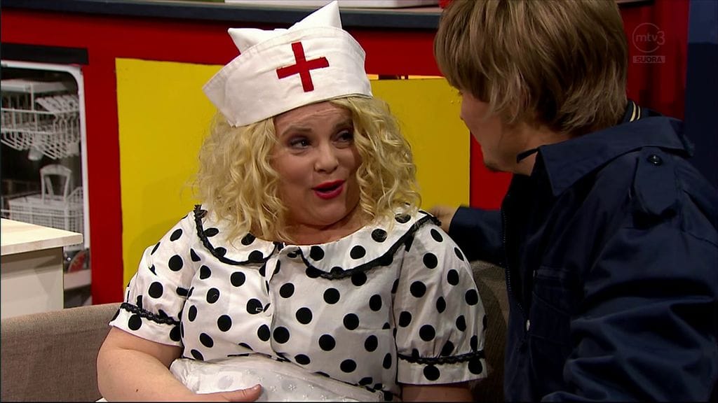 Salminen paljasti myös hauskan yksityiskohdan sketsistä. Hän joutui nimittäin improvisoimaan osan repliikeistä.