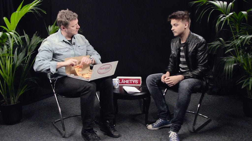 – Jos sä otat yhdenkin palan pitsaa vielä, niin sulla ei ole tv-töitä, Salminen mekastaa suu täynnä pitsaa.