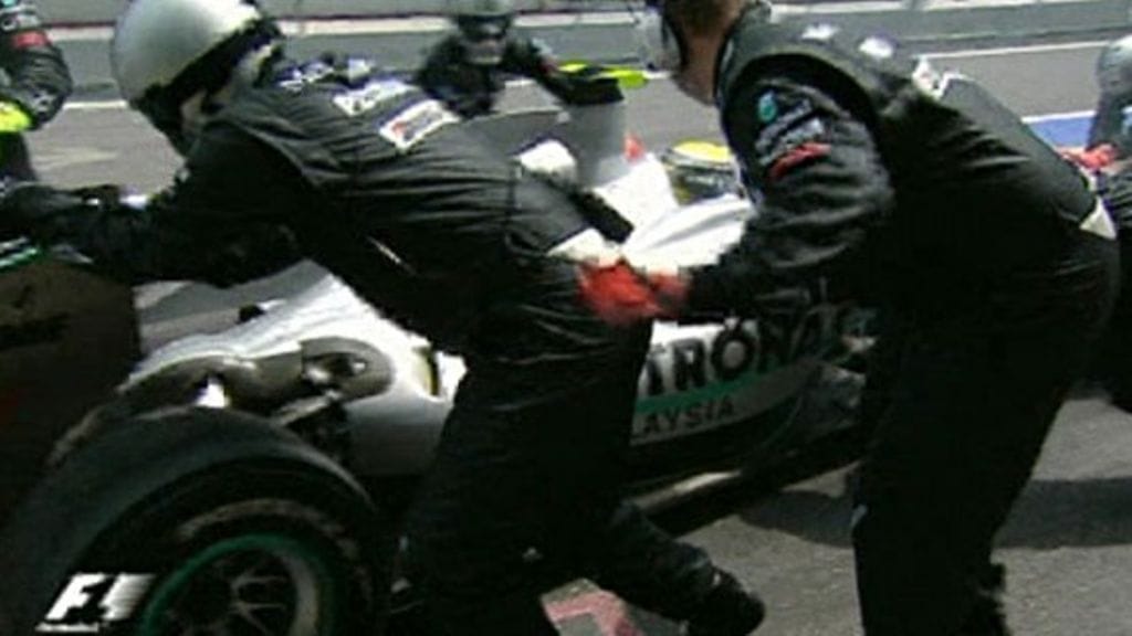 Varikkomiehet työnsivät Rosbergin auton takaisin ruutuun, jossa mutteri kiristettiin paikoilleen.