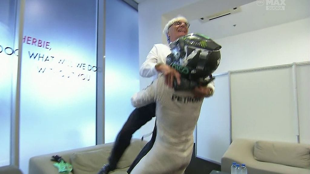 Rosberg riepotteli 84-vuotiasta Ecclestonen korkealle ilmaan ja jakeli halauksia ympäriinsä.