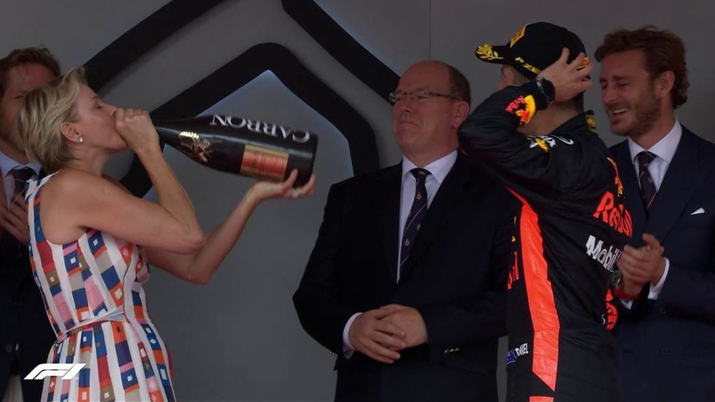 Monacon ruhtinas Albert II ja ja hänen vaimonsa ruhtinatar Charlene jäivät seuraamaan tapahtumia omalla paikalleen palkintopallin taakse ja joutuivat pian mukaan Ricciardon juhliin.