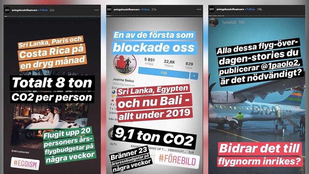 Ruotsissa kuohuttaa tällä hetkellä Instagram-tili Aningslösä influencers (vapaasti suomennettuna tietämättömät vaikuttajat), jonka tarkoituksena on kuvauksensa mukaan "laittaa merkille lentoliikenteen ilmastovaikutuksiin vaikuttavia tekijöitä ja julkaista niitä tarinoiden muodossa".