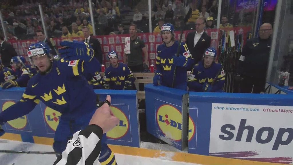 Ruotsalaishyökkääjä Lucas Raymond otti jääkiekon MM-kisojen ottelussa Tanskaa vastaan jäähyn, jollaista harvemmin näkee. SVT:n asiantuntija Mikael Renberg uskoi päävalmentaja Sam Hallamin olevan varmasti ärtynyt tapahtuneesta.