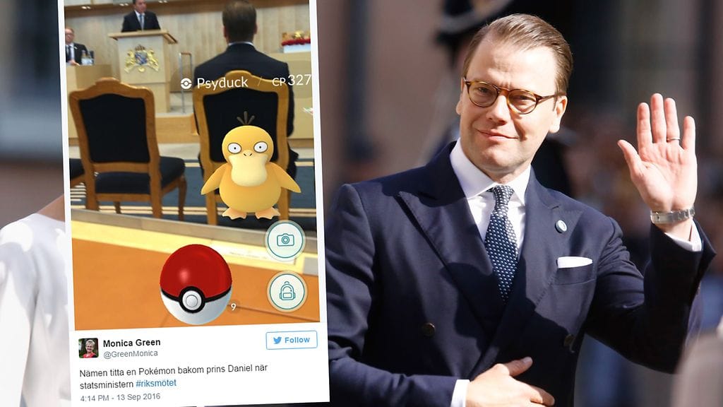Monica Greenin twiitistä huomaa, että hän löysi pokémonin valtiopäivien avajaisissa, aivan prinssi Danielin selän takaa samaan aikaan, kun pääministeri Stefan Löfven piti puhetta.
