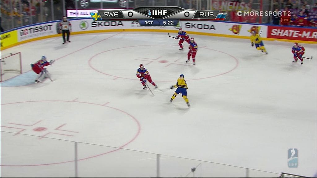 NHL-seura Carolinassa pelaavan Lindholmin veto livahti Venäjän maalivahdin Andrei Vasilevskin jalkojen välistä sisään. Maaliin loistavan syötön tarjoaa Viktor Rask.