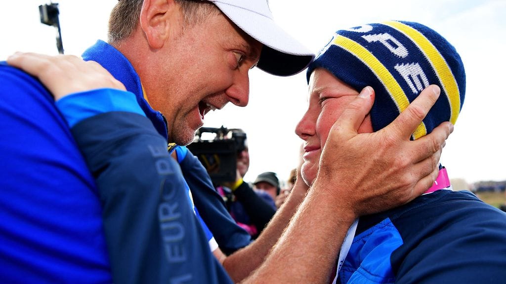 Englantilainen Ian Poulter pääsi viettämään herkkiä voitonjuhlia poikansa Luken kanssa golfin Ryder Cupin ratkettua Pariisissa sunnuntaina.